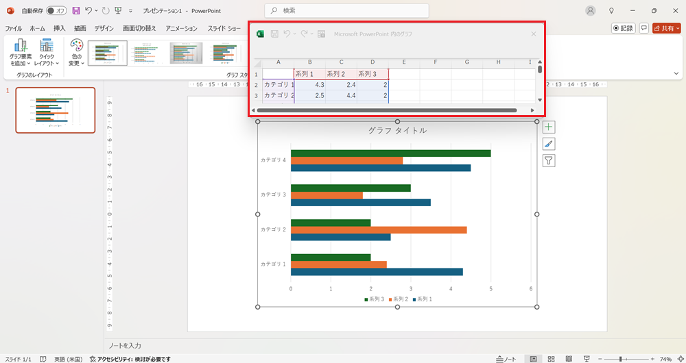 ExcelとPowerPointのグラフはリンクしているので、そこにデータを入力します。